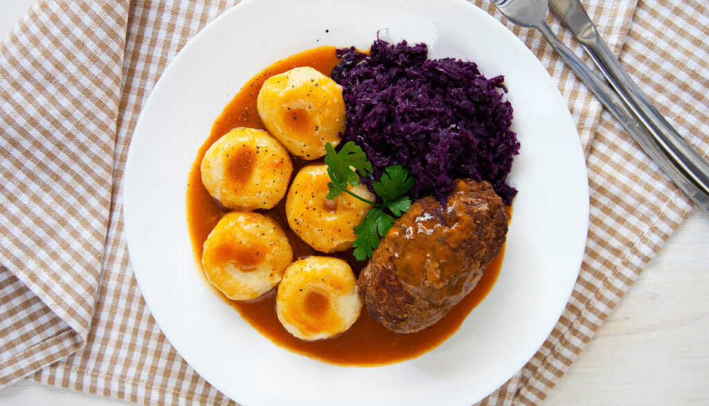 Rolada śląska z kluskami i modrą kapustą